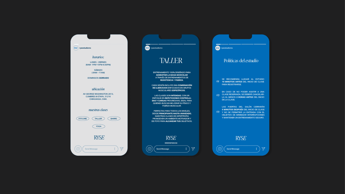 RYSE es más que un estudio de ejercicio; es un espacio comunitario donde la motivación y el bienestar se unen. La marca busca reflejar con su nueva imagen una evolución hacia un espacio más inclusivo, dinámico y accesible, manteniendo su compromiso con la excelencia en el fitness y el bienestar. Se aspira a proyectar una identidad moderna y vibrante que inspire a la comunidad a superar sus límites y encontrar el equilibrio entre cuerpo y mente.
